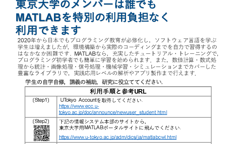 UTokyo Accountと*.u-tokyo.ac.jpドメインのメールアドレスにより、MATLAB本体とすべてのToolBoxが教育・研究に利用できるようになっています。